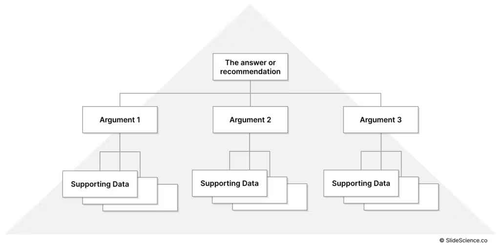 The Pyramid Principle means to start with the most important message first, then break it down to the supporting arguments – so that the reader can stop reading at any time having taken away the most important information: