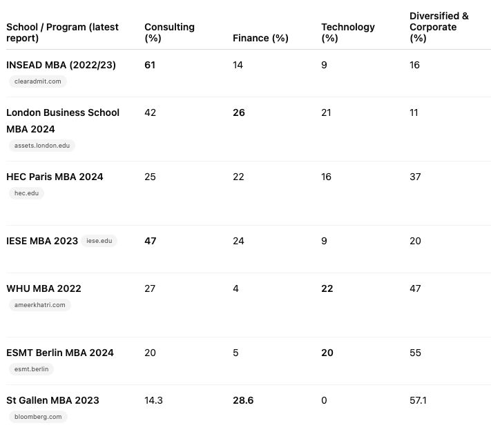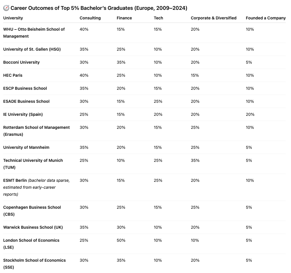 Consulting is almost always the most common option for the top graduates (except for TUM, SSE, LSE).